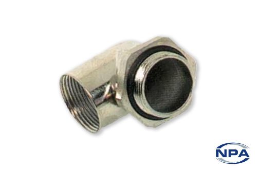 PG-21 right angled brass cable glands with a longer than standard tail end. Locknut and O-ring included.