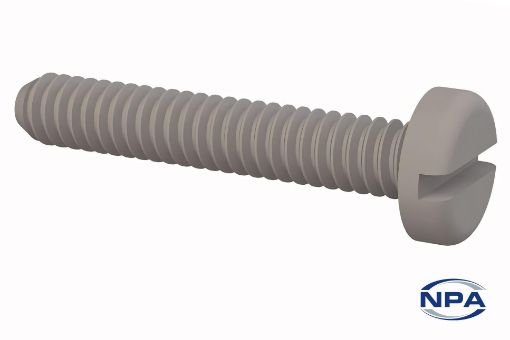 Machine screws with a smooth-edged pan head. Slotted for use with a flat head screwdriver.